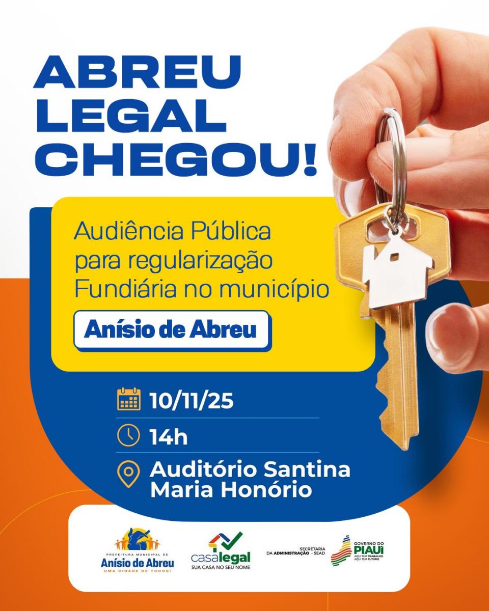 A Prefeitura de Anísio de Abreu convoca toda a população para participar da Audiência Pública do Programa de Regularização Fundiária — uma grande oportunidade de garantir mais dignidade, segurança jurídica e desenvolvimento para o nosso município.